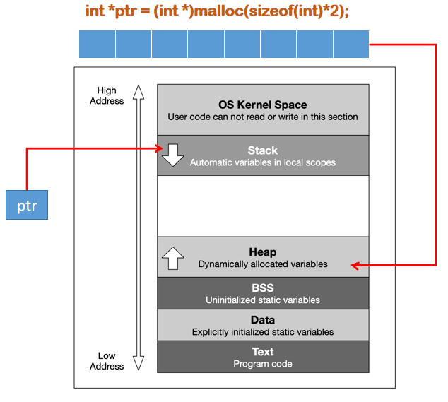 Bộ nhớ đã được khởi tạo với giá trị 0 trong trường hợp này. Tại thời điểm biên dịch, chỉ có không gian cho con trỏ được dành riêng (trên ngăn xếp). Khi con trỏ được khởi tạo, một khối bộ nhớ có kích thước sizeof(int) byte được cấp phát (trên heap) tại thời điểm chạy chương trình. Con trỏ trên ngăn xếp sau đó trỏ đến vị trí bộ nhớ này trên vùng nhớ heap.