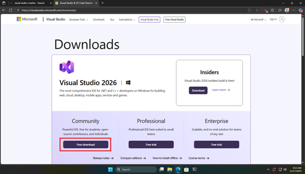 Link tải Visual Studio Community: https://visualstudio.microsoft.com/vs/community/