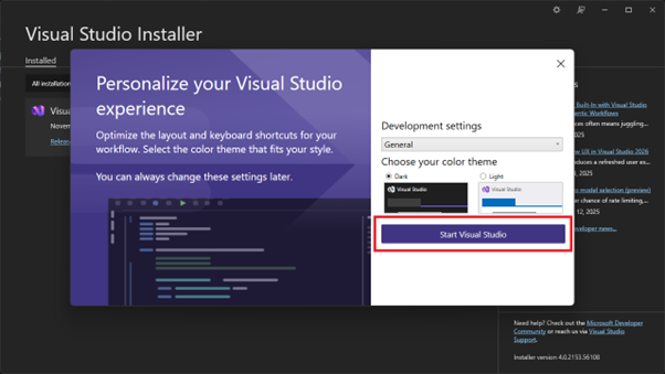 Chọn giao diện sáng tối theo sở thích và nhấn vào Start Visual Studio sẽ tới giao diện chính của VS.