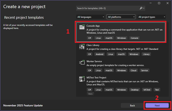 Tiếp theo sẽ chọn template, ta sẽ chọn Console App và bấm Next như hình dưới đâyTiếp theo sẽ chọn template, ta sẽ chọn Console App và bấm Next như hình dưới đây