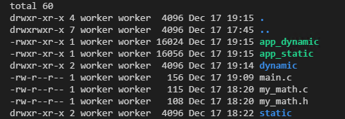 - Tạo thư viện tĩnh bằng lệnh ar (archiver). Tên thư viện phải bắt đầu bằng lib và kết thúc bằng .a. Lệnh này sẽ tạo ra file libmymath.a.