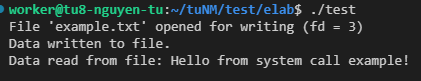 Line 21-22: write() ghi dữ liệu từ text vào file được mở bởi fd. strlen(text) xác định số byte cần ghi.
