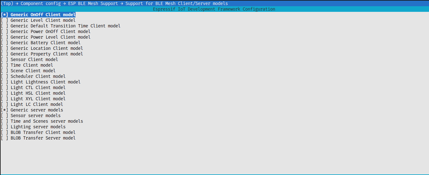 Component config ---> ESP BLE Mesh Support --> Support for BLE Mesh Client/Server models( ở gần cuối menu)